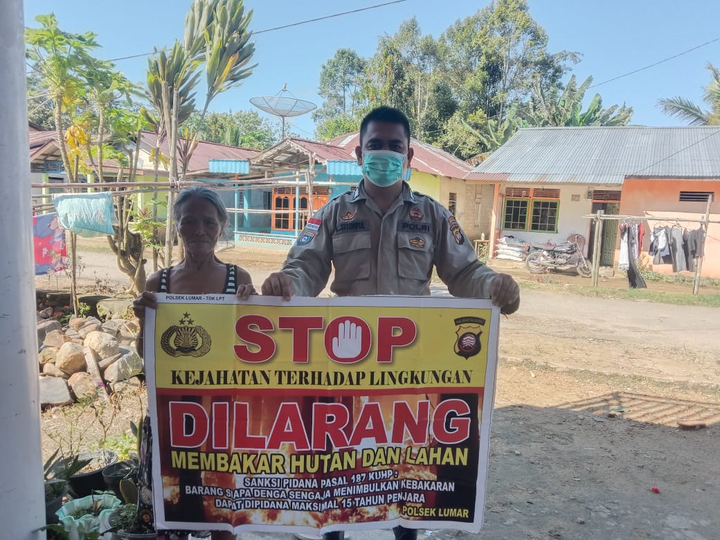 Para personel Bhabinkamtibmas Polsek Lumar selalu mengajak warga masyarakatnya agar bersama sama menjaga lingkungan sekitar dari bahaya karhutla dan tidak lupa juga memberikan sosialisasi tentang dampak dan bahaya membakar hutan dan lahan, serta sangsi pidana membakar hutan dan lahan.