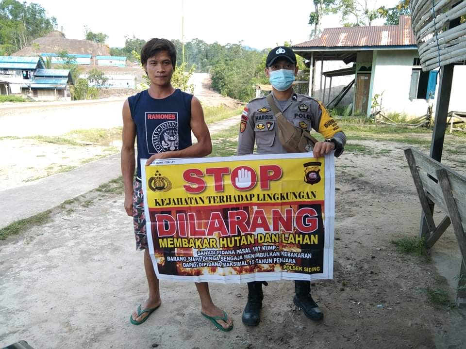 Anggota Polsek Siding Bripda Dainel Harris dalam Pelaksanaan Kegiatan Cegah Karhutla di Wilkumnya menyampaikan bahwa dalam rangka antisipasi Kebakaran hutan dan lahan Polsek Siding secara rutin akan terus-menerus melakukan Patroli sosialisasi dan edukasi kepada masyarakat dan pemetaan daerah – daerah rawan terjadinya kebakaran hutan dan lahan dengan Harapan Wilkum Polsek Siding Bebas Dari Kebakaran hutan dan lahan.