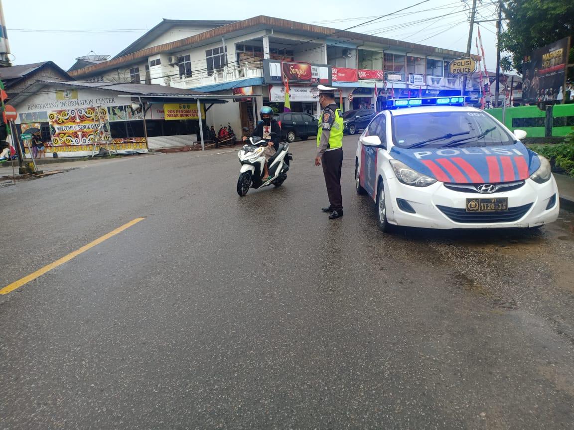 Bengkayang- Personil Satuan Lalu Lintas Polres Bengkayang melaksanakan patroli dan pengaturan lalu lintas untuk mencegah terjadinya kecelakan lalu lintas pada musim penghujan di jalan raya dan merupakan tugas pokok yang tidak lepas dari kepolisian, Minggu (15/08/2021).