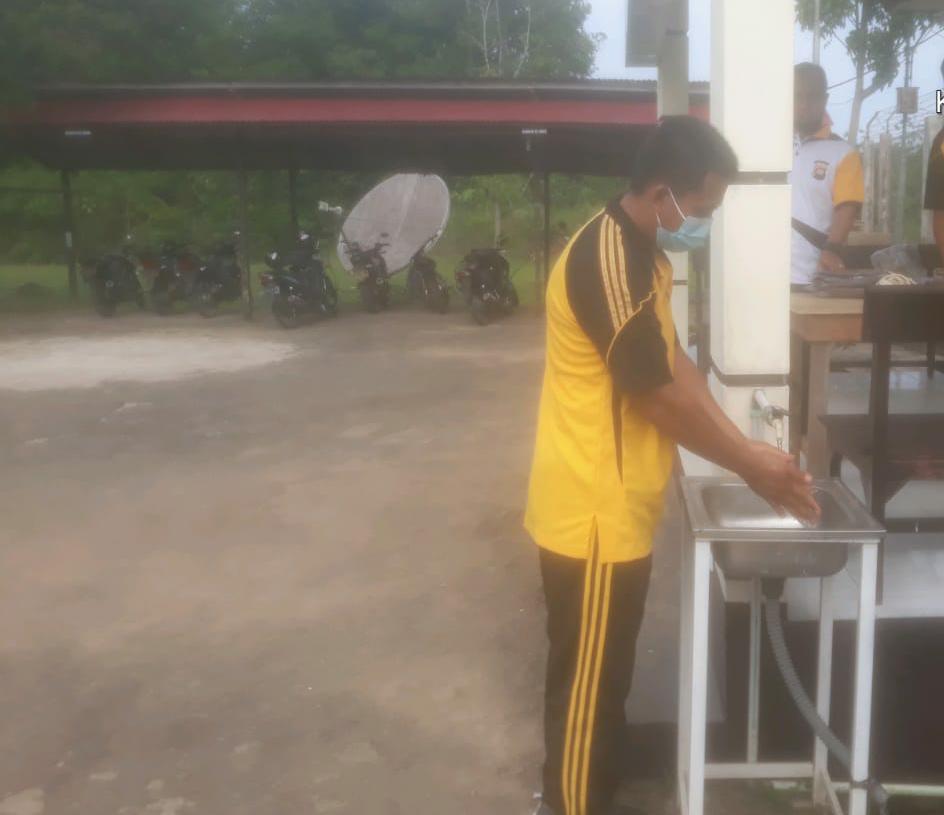 Mengantisipasi penularan virus covid 19, Personil polsek jagoi babang menerapkan protokol kesehatan untuk mencegah terjadinya penularan yaitu rutin mencuci tangan pakai sabun serta tetap disiplin menerapkan protokol kesehatan