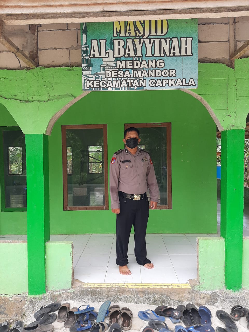 Anggota Polsek Capkala Brigadir M.Fahrizal melaksanakan pengamanan (Pam) Sholat Jum’at di Masjid Al Bayyinah Medang Ds. Mandor Kec. Capkala Kab. Bengkayang. Jum’at (19/11/2021).