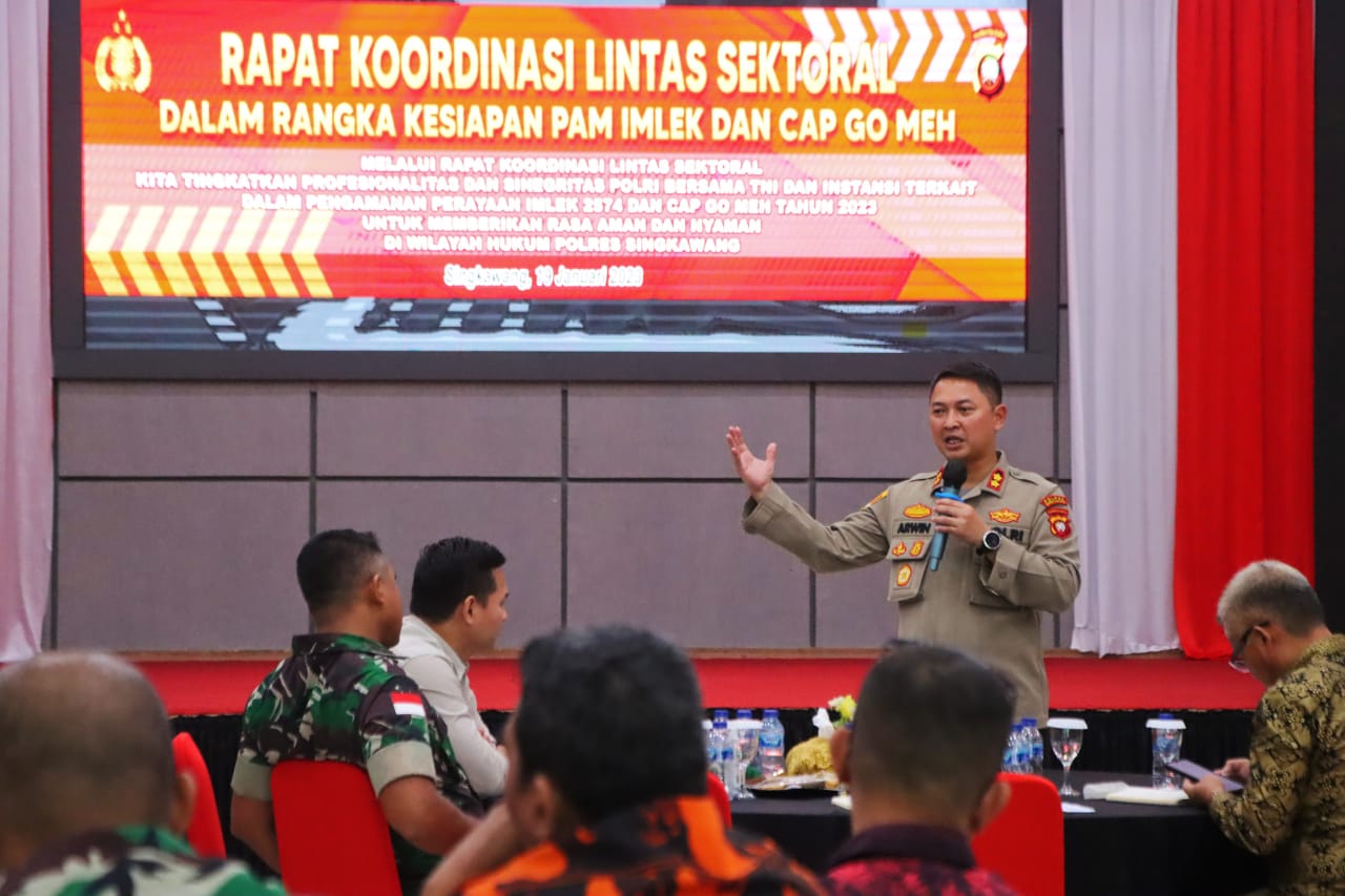 Singkawang, Kalbar. – Telah dilaksanakan kegiatan Rapat Koordinasi Lintas Sektoral dalam rangka Kesiapan Pengamanan Imlek 2574 dan Cap Go Meh Tahun 2023 dengan tema “Melalui Rapat Koordinasi Lintas Sektoral Kita Tingkatkan Profesionalitas dan Sinergitas Polri Bersama TNI dan Instansi Terkait Dalam Pengamanan Perayaan Imlek 2574 dan Cap Go Meh Tahun 2023 Untuk Memberikan Rasa Aman dan Nyaman di Wilayah Hukum Polres Singkawang” bertempat di Balairung Kantor Walikota Singkawang alamat Jl. Firdaus H. Rais I No. 01 Kel. Pasiran Kec. Singkawang Barat Kota Singkawang, Kamis (19/1/2023).