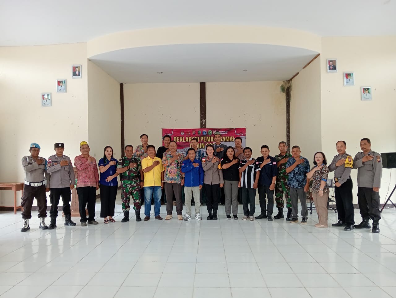 Kepolisian Sektor Sungai Betung, bersama Forkopincam, tokoh Adat/Agama/ Masyarakat, serta perwakilan Partai Politik dan penyelengara pemilu di kecamatan Sungai Betung melaksanakan Deklarasi Pemilu Damai tahun 2024, di Aula Kantor Camat Sungai Betung, Kamis (23/11/2023).