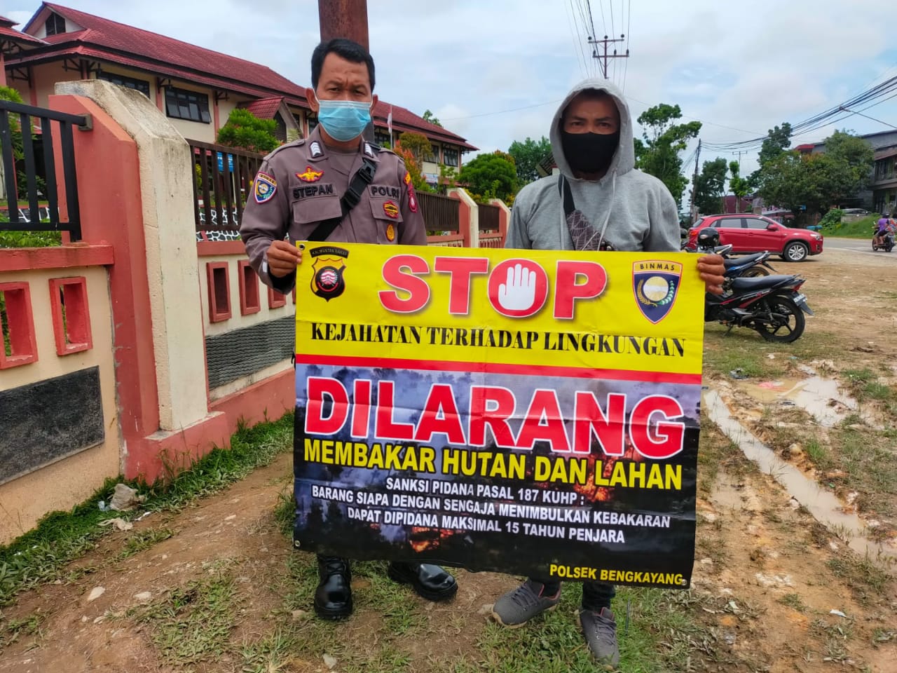 Peran Bhabinkamtibmas bersama warganya sosialisasi dan membentangkan banner, sekaligus menghimbau warga tidak melakukan pembakaran hutan dan lahan.