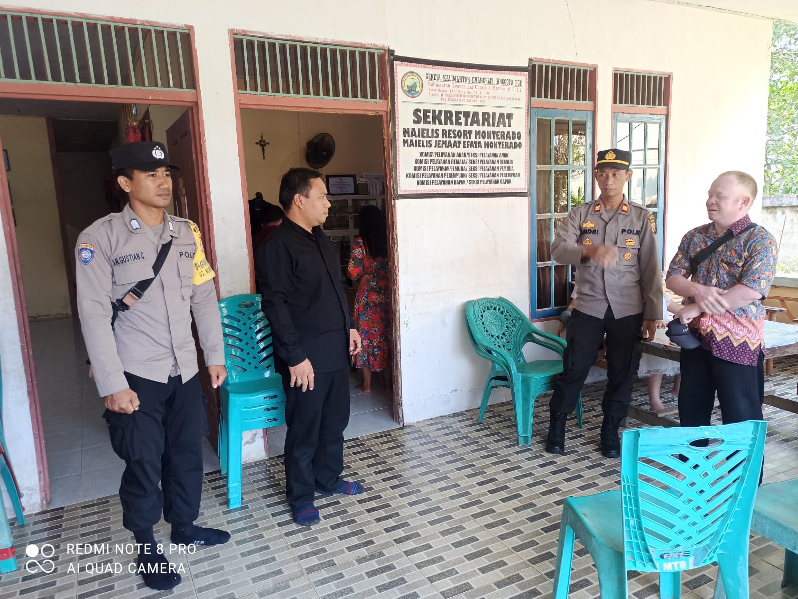 Polsek Monterado Polres Bengkayang Polda Kalbar kembali melaksanakan kegiatan rutin setiap hari minggu bertema “Minggu Kasih” mendatangi Gereja yang melaksanakan ibadah di pagi hari bersama anggota.