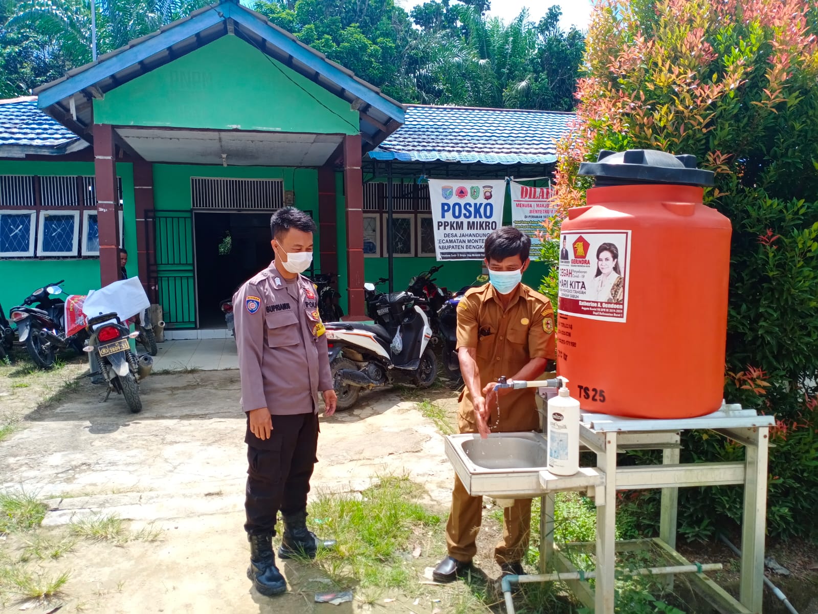 Bhabinkamtibmas Desa Jahandung Bripka Suprianus menyambangi Kantor Desa bertemu dengan warga bersilaturahmi dan tatap muka menjalin kerja sama menjaga kamtibmas yang kondusif ditengah pandemi Covid19.