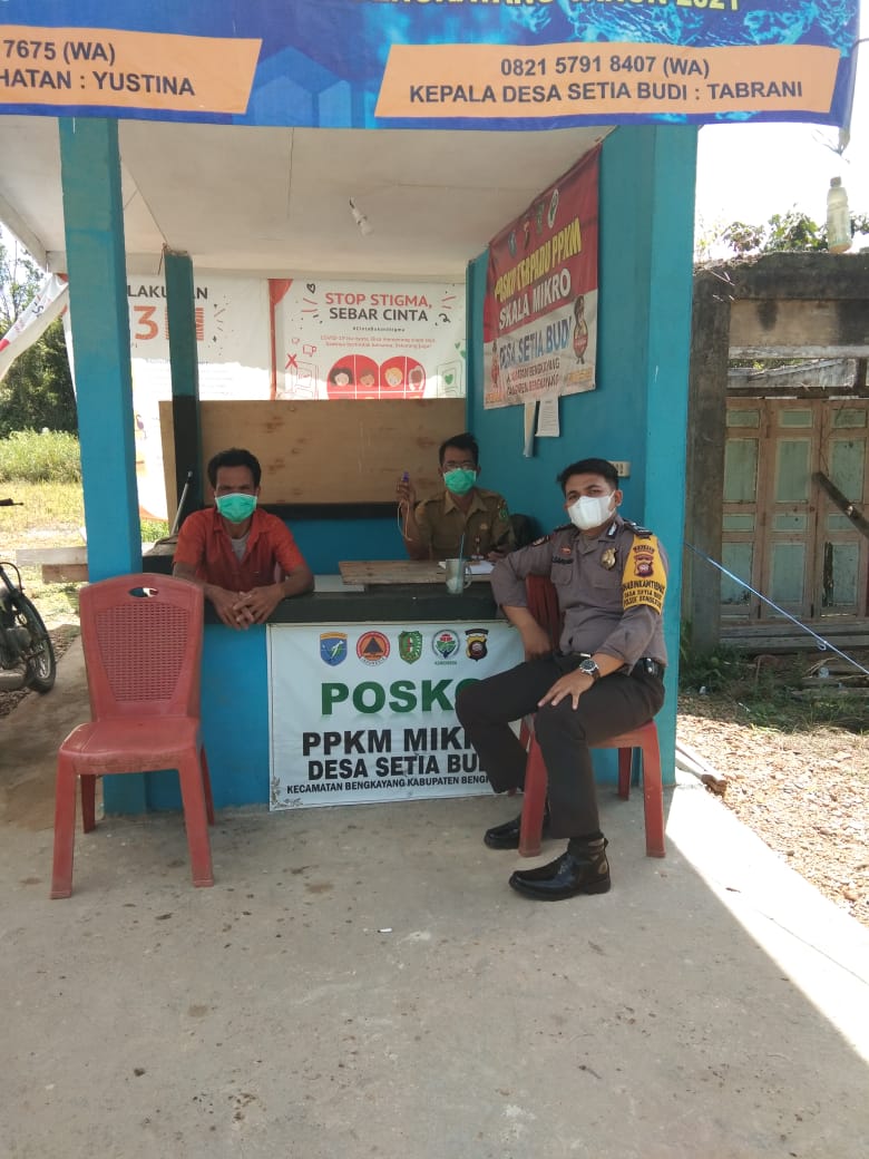 Bhabinkamtibmas Desa Setia Budi Polsek Bengkayang Polres Bengkayang Briptu Eko Saputra melaksanakan kontrol Posko PPKM (Pemberlakuan Pembatasan Kegiatan Masyarakat) bersekala Mikro,di Desa Binaanya dan ikut serta dalam kegiatan di Pos Tetsebut Sabtu (26/06/2021).
