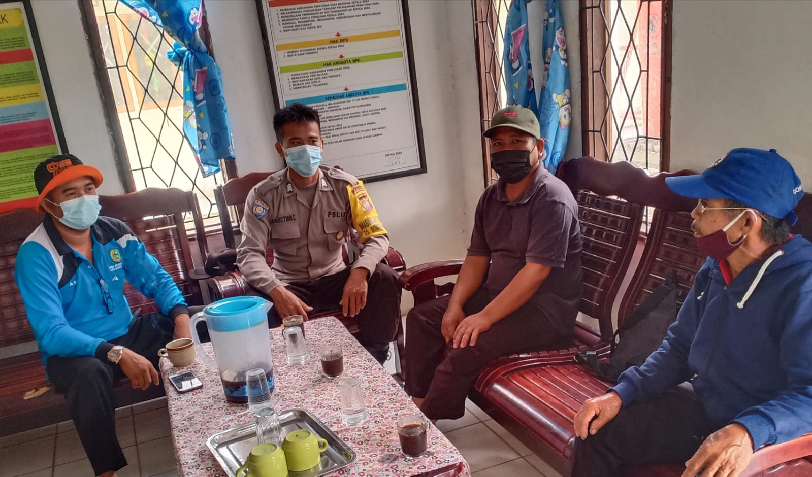 Saat berkunjung di Kantor Desa Bhabinkamtibmas Desa Beringin Baru Brigadir Gustian rutin berkoordinasi guna menjaga keamanan dan ketertiban di desa binaan di tengah pandemi Covid19.