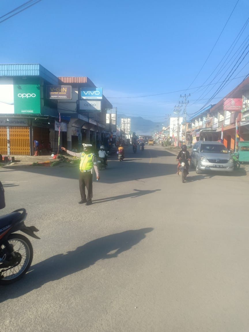 Bripka Ahjanu dan Brigadir Yeyeh melaksanakan pengaturan lalu lintas di jalan Jerendeng AR Bengkayang tepatnya di simpang Laut Kidul Bengkayang dengan tujuan untuk menjaga keselamatan masyarakat yg menyebrang jln dari kecelakaan lalu lintas.