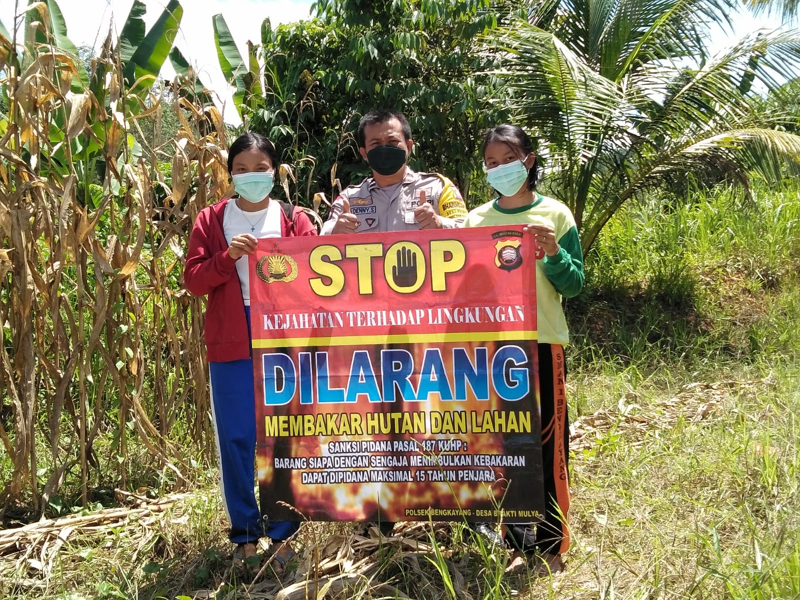 Peran Bhabinkamtibmas bersama warganya sosialisasi dan membentangkan banner, sekaligus menghimbau warga tidak melakukan pembakaran hutan dan lahan.