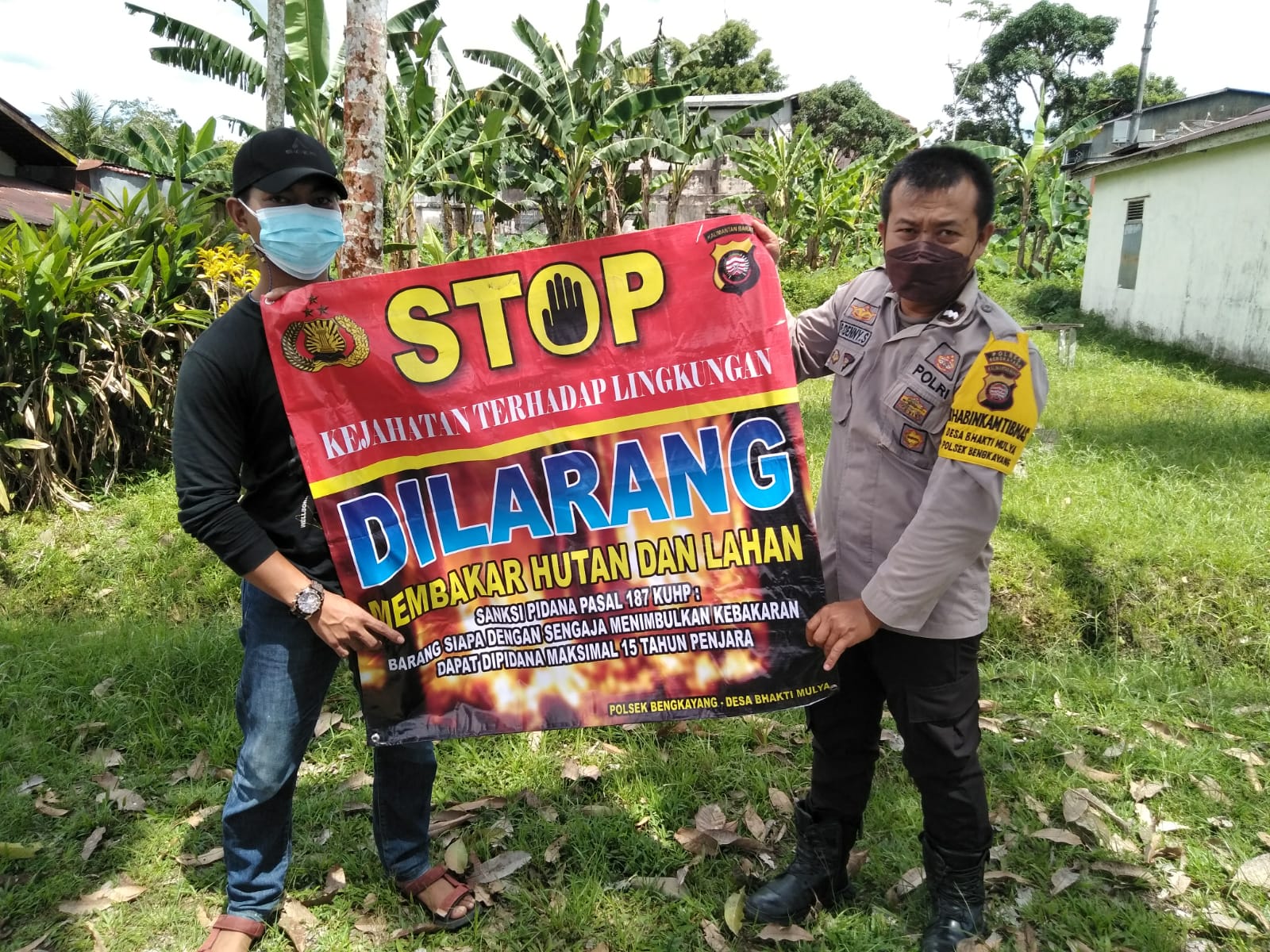 Peran Bhabinkamtibmas bersama warganya sosialisasi dan membentangkan banner, sekaligus menghimbau warga tidak melakukan pembakaran hutan dan lahan.