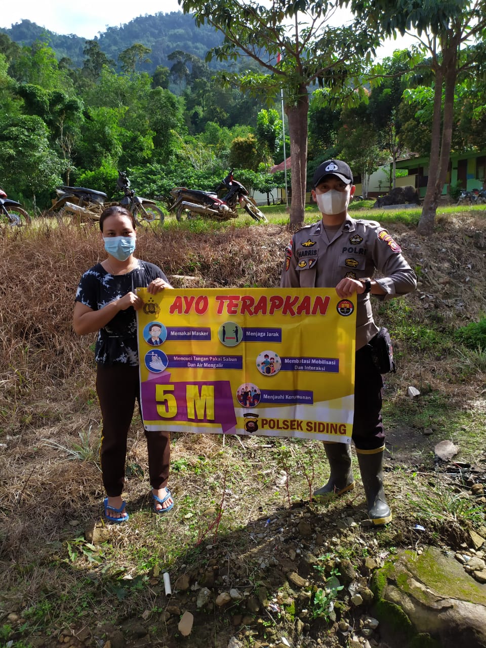 Personel Polsek Siding Bripda Dainel Harris melaksanakan patroli sambang himbau warga untuk menerapkan protokol kesehatan dengan mengunakan masker dan mengimbau agar tidak berkerumun untuk memutus mata rantai penyebaran Virus Corona (Covid 19), Kamis (12/05/2022).