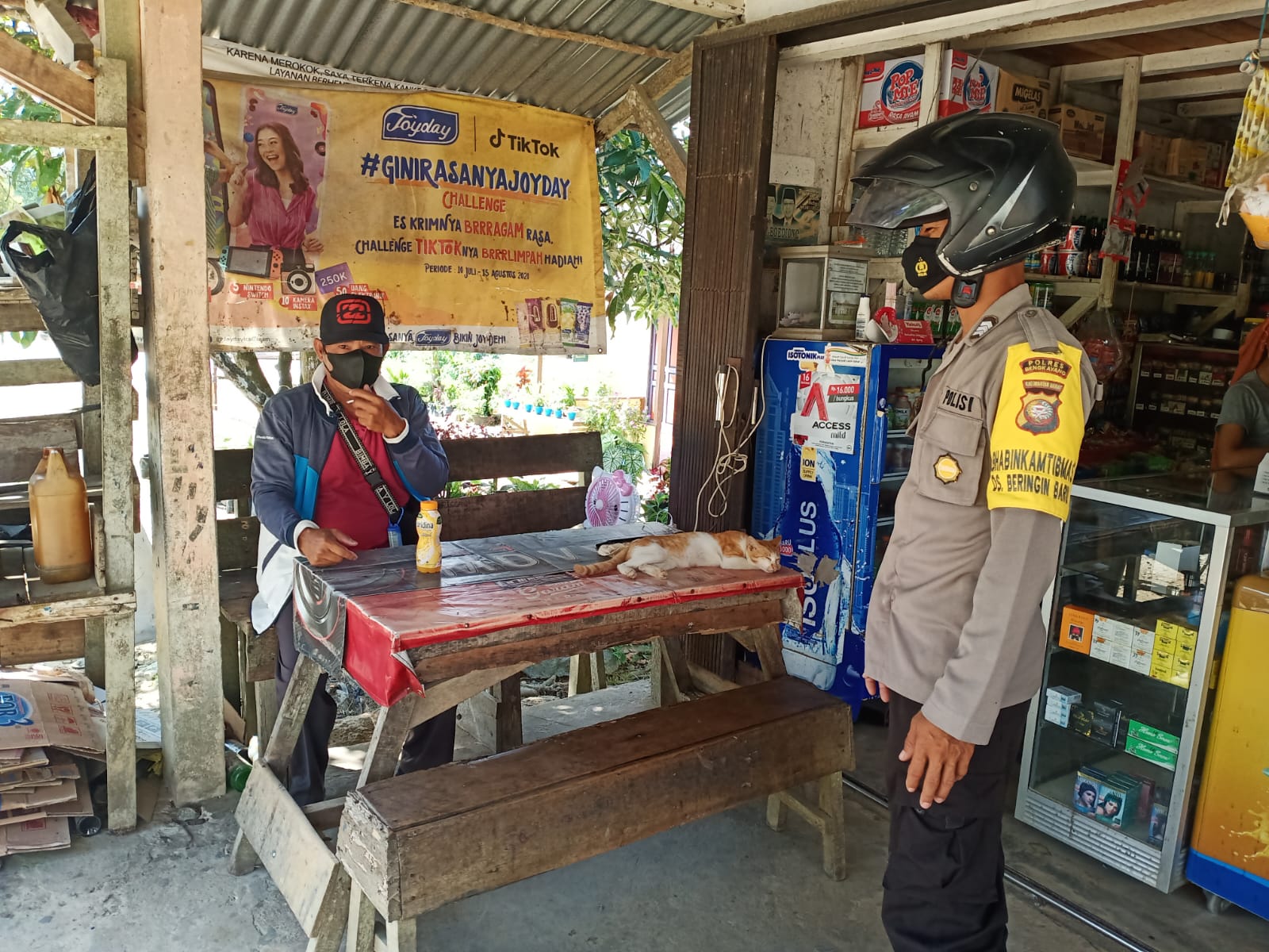 Dalam kegiatan Patroli, terlihat Brigadir Gustian menghampiri warga di sebuah warung, secara humanis menyampaikan himbauan 5 M guna mencegah penyebaran virus Covid19, Senin(16/08).