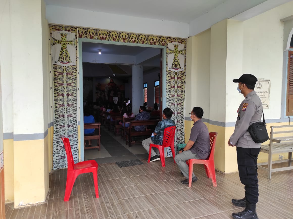 Polres Bengkayang – Polsek Samalantan. Anggota Polsek Samalantan Polres Bengkayang melaksanakan tugas pengamanan di Gereja Kalimantan Evangelis (GKE) Desa Samalantan Kecamatan Samalantan, Bengkayang. Minggu (27/6/2021) pagi