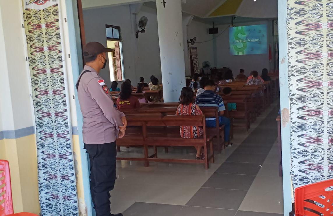 Anggota Polsek Samalantan Polres Bengkayang Polda Kalbar pada Minggu (6/3/2022) pagi melaksanakan tugas pengamanan di Gereja Kalimantan Evangelis (GKE) Desa Samalantan Kecamatan Samalantan, Bengkayang.