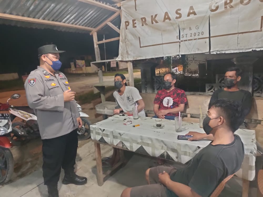 Personel Patroli Polsek Monterado Aipda Kalba melaksanakan Kegiatan Kepolisian Yang Ditingkatkan dengan patroli malam ke tempat berkumpulnya warga Desa Monterado Kec. Monterado, Rabu(06/04) malam.