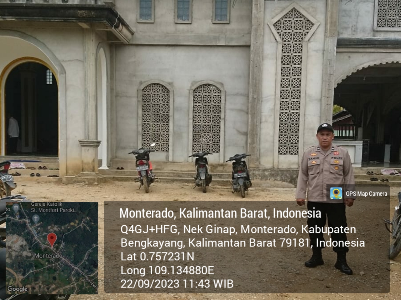 Kapolsek Monterado Polres Bengkayang Polda Kalbar IPTU Andri Supriyanto beserta anggota melaksanakan giat “Jumat Curhat” dengan melakukan pengamanan Sholat Jumat di Masjid yang ada di Kecamatan Monterado