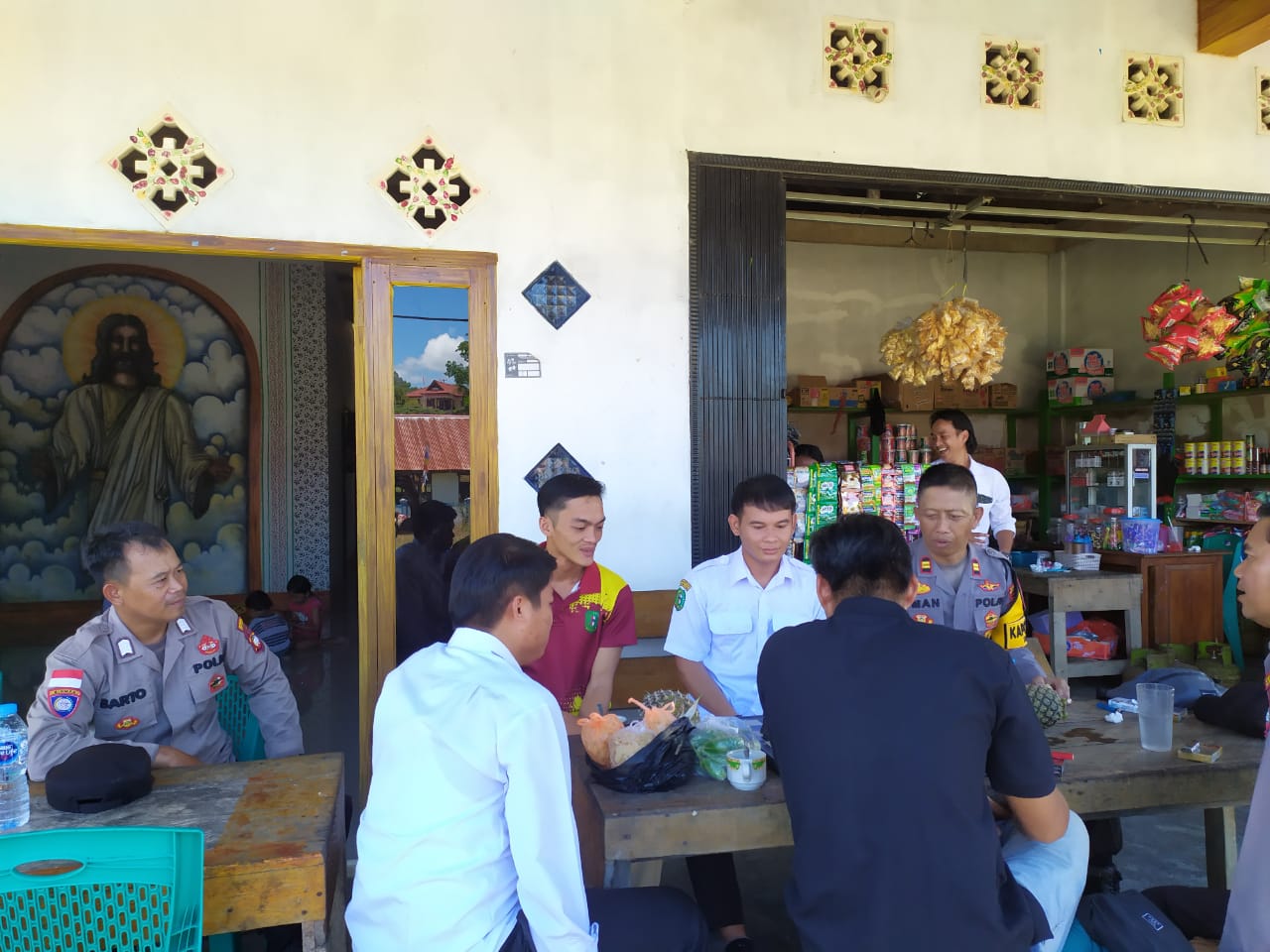 Tampak Kapolsek Siding Iptu Oman Kurnianto sedang ngopi bareng warga dan diikuti beberapa personelnya hadir dalam kegiatan tersebut,