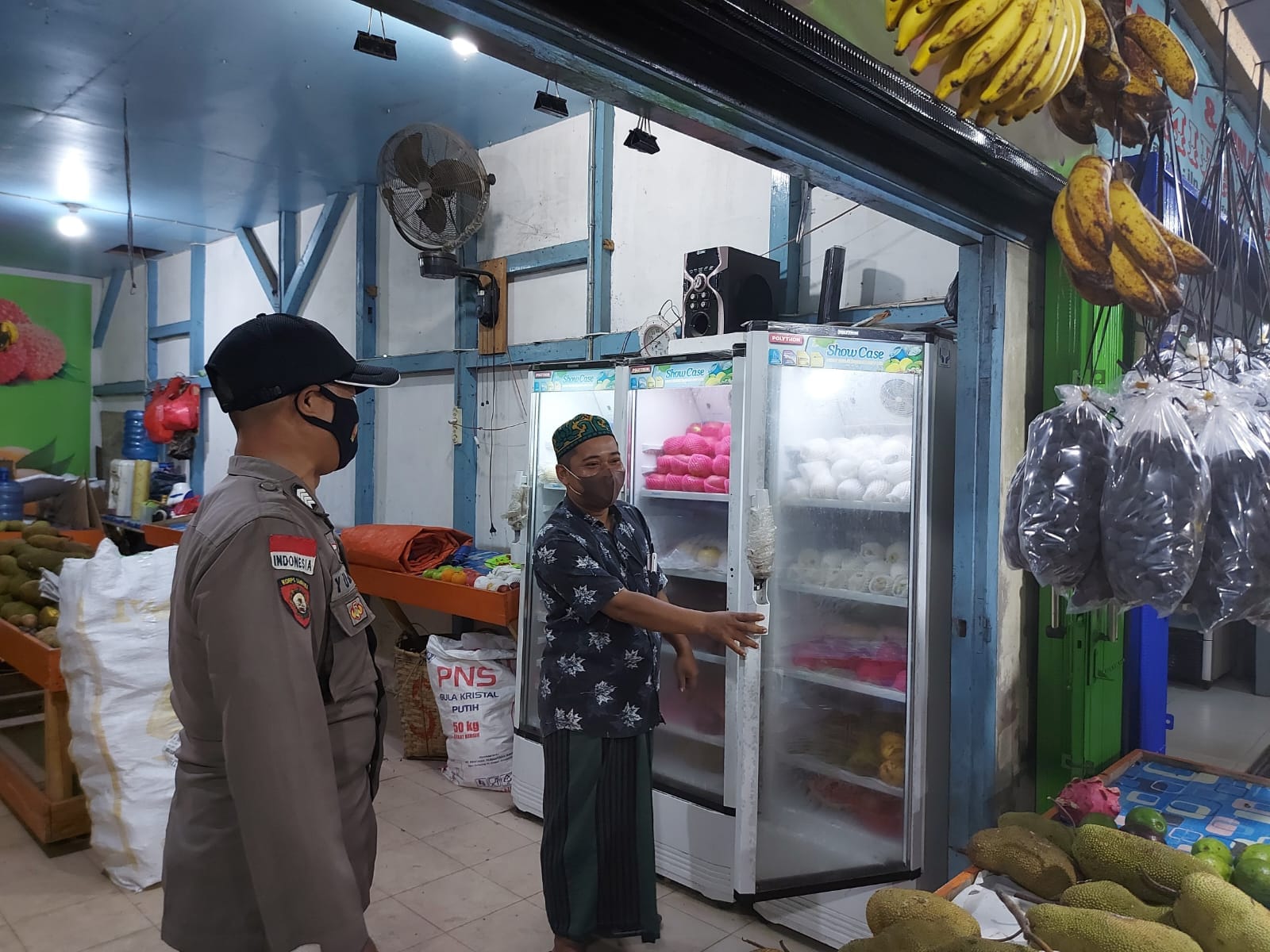 KA SPKT Bripka Suyudi memberikan himbauan kepada masyarakat agar bersama – sama menjaga Kamtibmas dilingkungan kita dan juga pembagian masker kepada seorang pedagang untuk menjaga protokol kesehatan pada masa pandemi covid – 19.