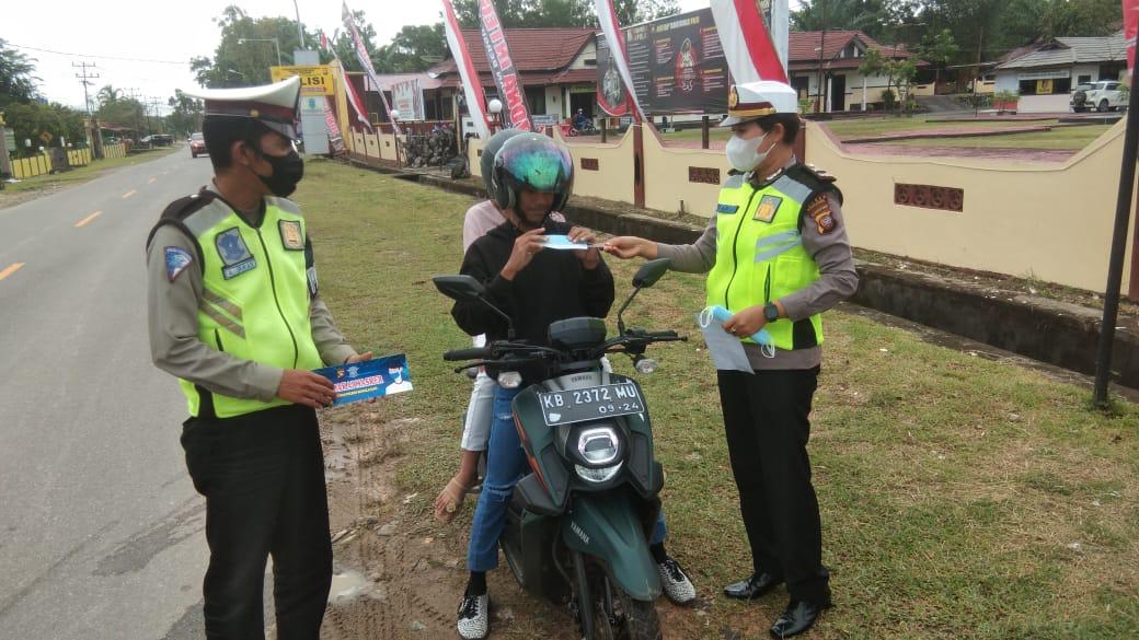 Terpantau personel Satlantas Polres Bengkayang membagikan masker gratis kepada para masyarakat di Depan Polres Bengkayang Jalan Sanggau Ledo Bengkayang.