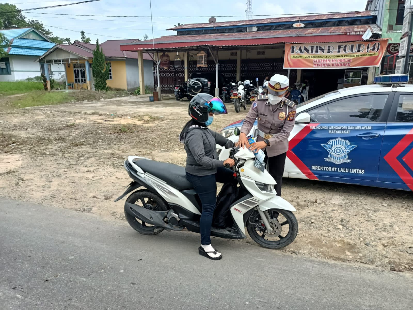 Selain memberikan masker secara gratis, pihaknya juga melaksanakan penempelan stiker kepada para pengendara yang melintas di Depan Mapolres Bengkayang.