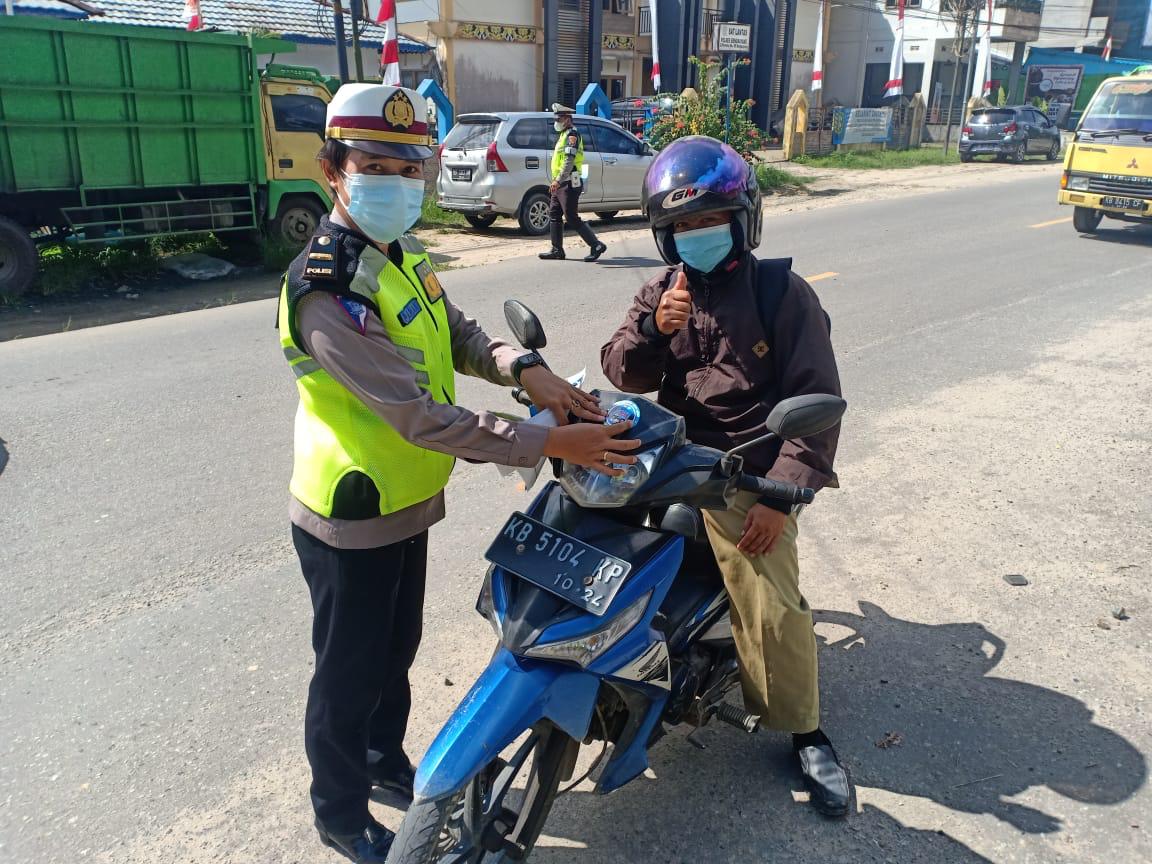 Selain memberikan masker secara gratis, pihaknya juga melaksanakan penempelan stiker kepada para pengendara yang melintas di Depan Pos Lantas Bengkayang.