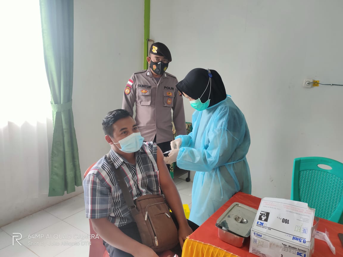 Polres Bengkayang – Kanit Samapta Polsek Ledo Polres Bengkayang Polda Kalbar melakukan pengamanan dan monitoring pada saat pelaksanaan vaksinasi covid-19 bagi Tenaga Guru di Puskesmas Ledo. Senin (21/06/2021).