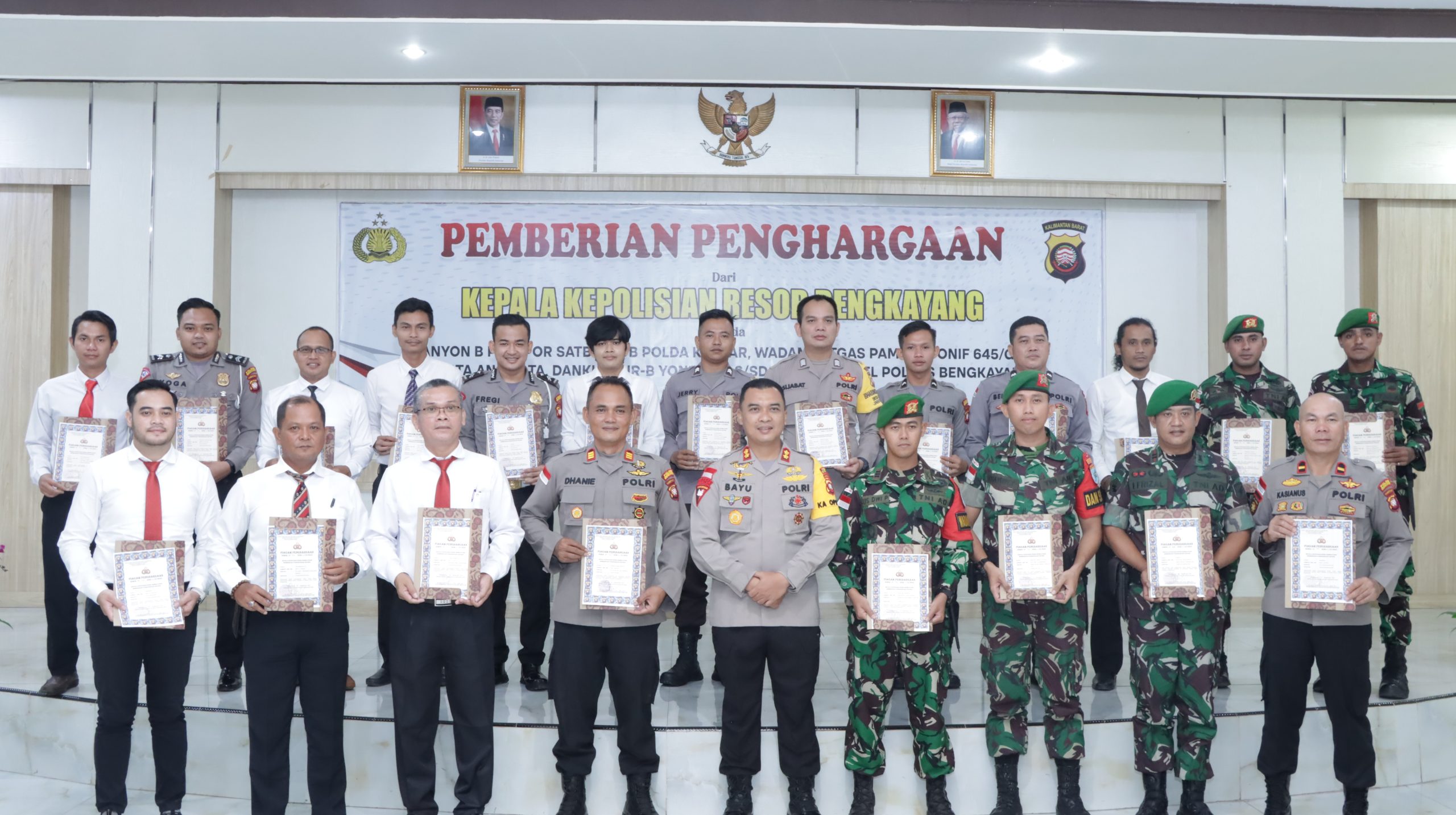 Polres Bengkayang – Kapolres Bengkayang Polda Kalbar AKBP Dr. Bayu Suseno, SH, SIK, MM, MH memberikan penghargaan kepada personel Brimob, TNI dan anggota Polres Bengkayang. Pemberian penghargaan dilakukan pada Senin, (19/09/22) pagi di Aula Polres Bengkayang.