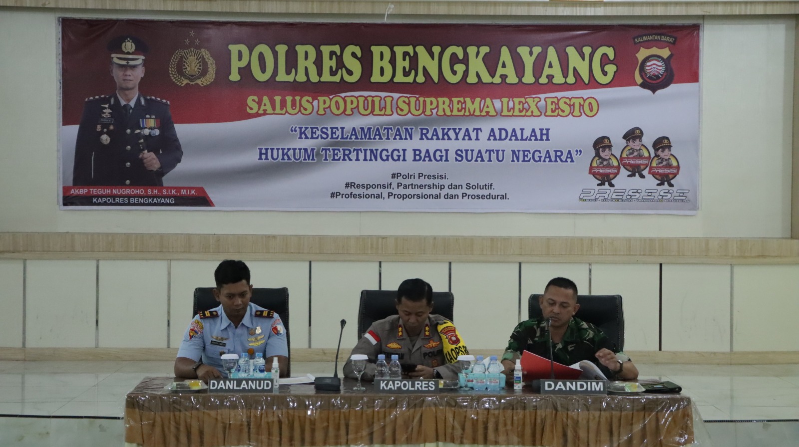 Rapat yang digelar di Aula Tunggal Panaluan Polres Bengkayang, Senin (11/12/23) siang, diikuti Kapolres Bengkayang serta Dandim 1209 Bengkayang Letkol INF Albertinus Mariano, S.E., Pasi Ops Kodim 1209 Bengkayang, Dansat Pom Lanud Harry Hadisoemantri, Pju Polres Bengkayang dan Dinas Perhubungan Bengkayang.