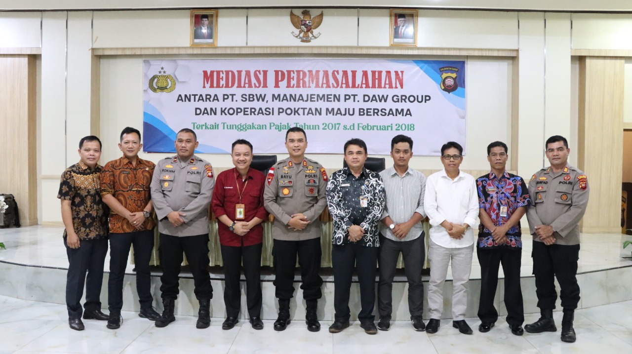 Bengkayang, Kalbar – Kapolres Bengkayang AKBP Dr. Bayu Suseno, S.H., S.I.K., M.M., M.H. mengelar mediasi permasalahan antara Manajemen PT. SBW, PT. DAW Group dan Koperasi Poktan Maju Bersama terkait Tunggakan Pajak Tahun 2017 sampai dengan Februari 2018, bertempat di Aula Tunggal Panaluan Polres Bengkayang. Kamis (19/1/23) pagi.