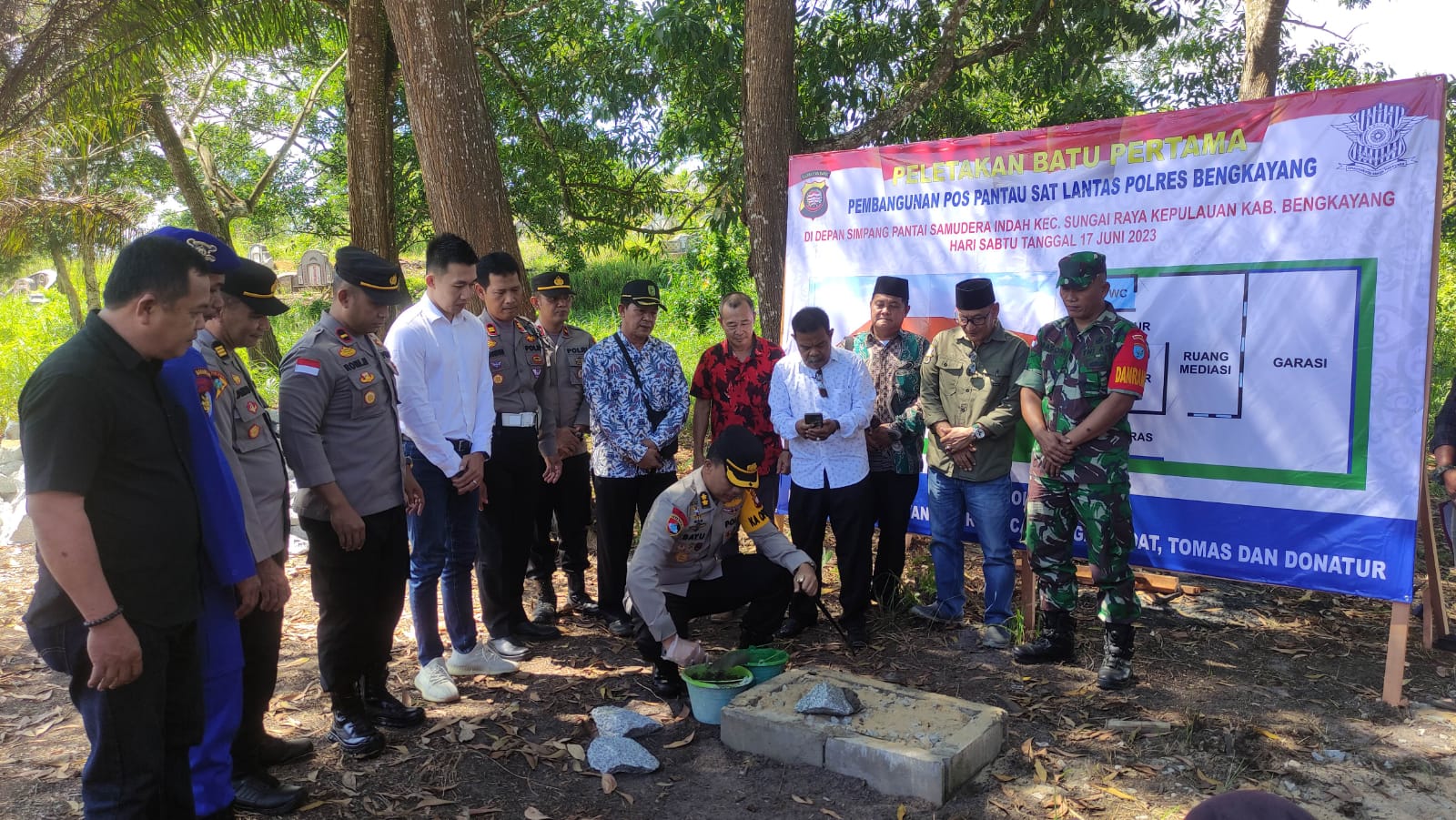Bengkayang, Kalbar – Kepala Kepolisian Resor Bengkayang Polda Kalbar AKBP Dr. Bayu Suseno, S.H., S.I.K., M.M., M.H. meletakkan Batu Pertama Pembangunan Pos Pantau Sat Lantas Polres Bengkayang di Kecamatan Sungai Raya Kepulauan, Sabtu (17/6/23) pagi.