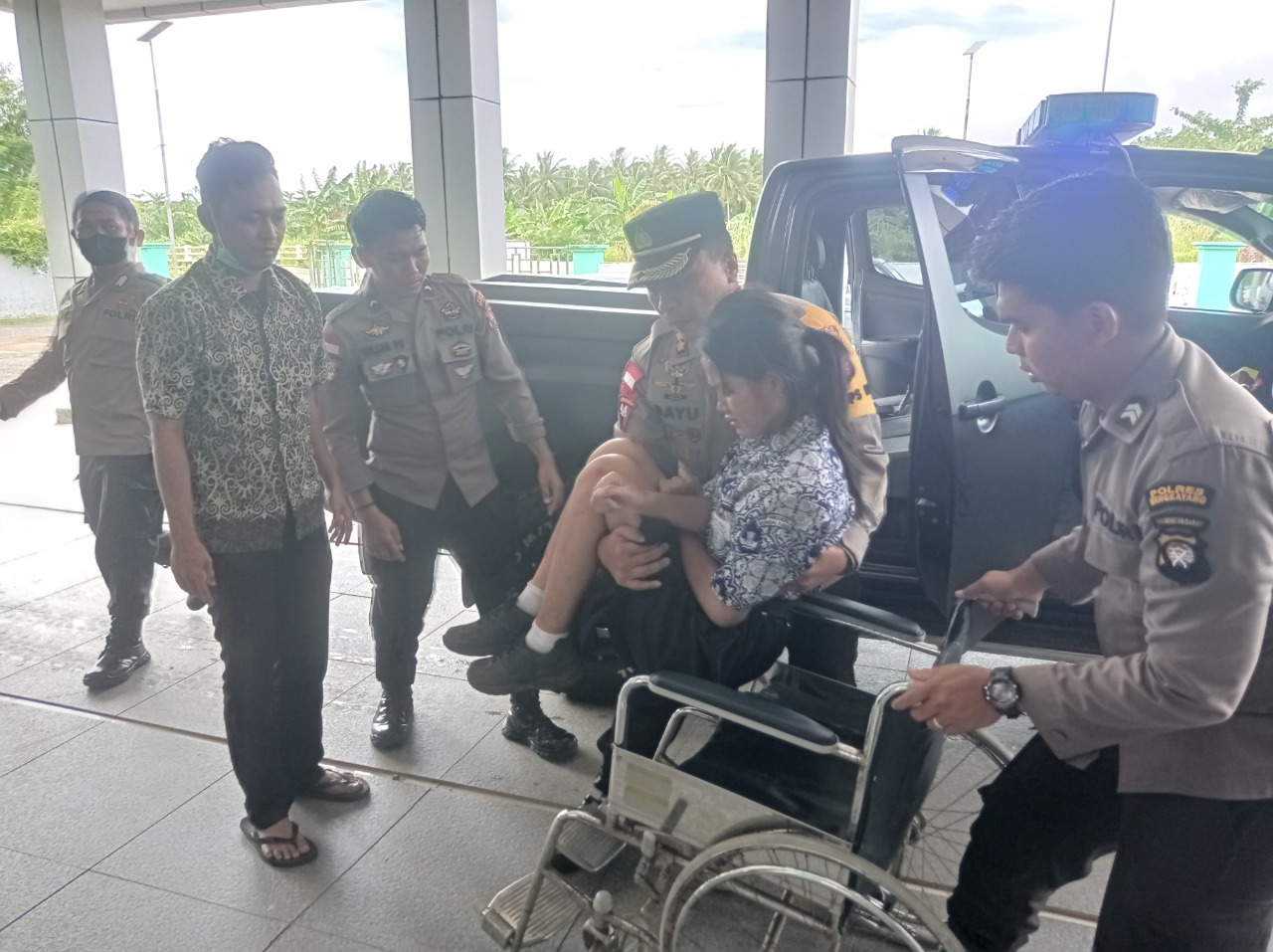 Tampak Kapolres juga turut menggendong korban atas nama Selly karena yang bersangkutan mengalami luka di bagian kepala sehingga tidak mampu untuk berjalan sendiri.
