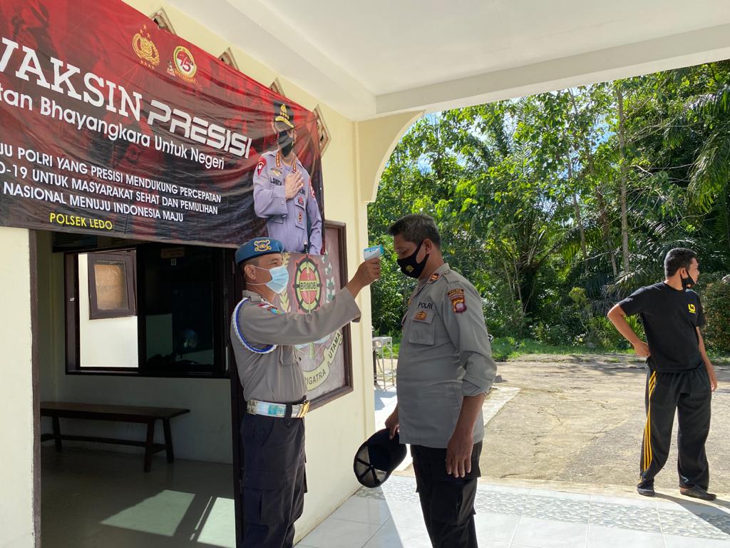 Kapolsek Ledo Iptu Asep Maulana menuturkan, menerapkan protokol Kesehatan covid19 dilingkungan Polsek Ledo untuk memastikan Personilnya yang akan melaksanakan tugas dalam kondisi sehat, baik dan tidak terjangkit covid19 serta lingkungan Mako Polsek Ledo tetap bersih dan sehat. Tutur Iptu Asep Maulana