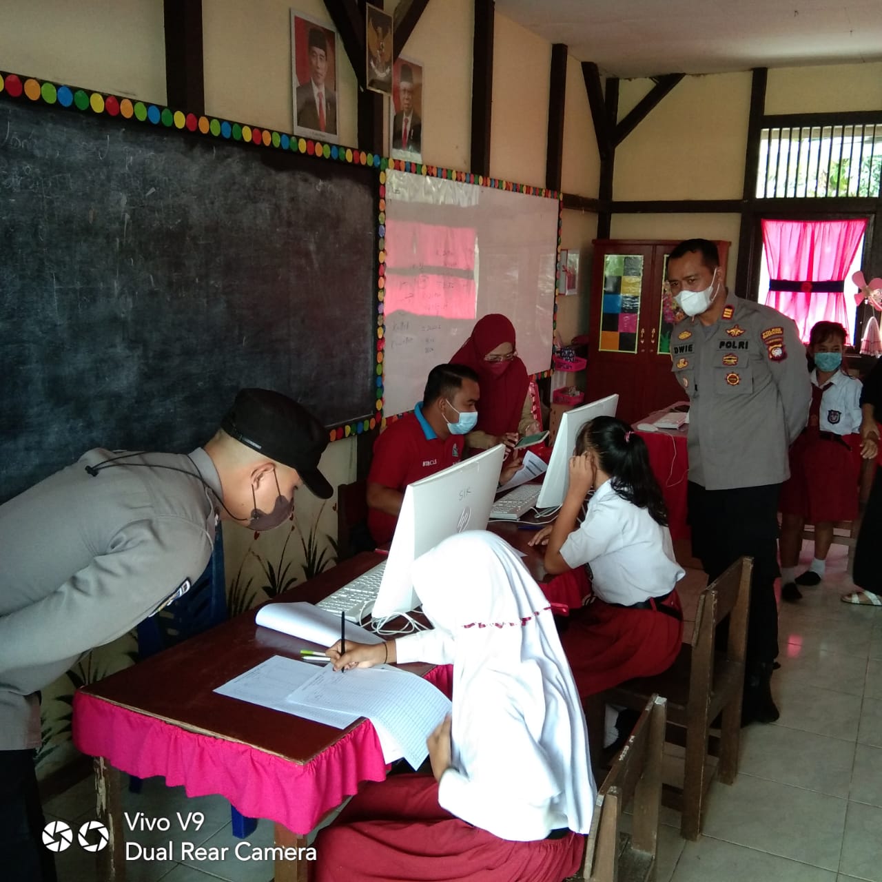 Polsek Sungai Raya – pada hari selasa Tanggal 18 Januari 2022, Kapolsek Sungai Raya AKP DWI RAHARJO, S.H.,M.H memantau Pelaksanaan Vaksinasi di Sekolah Dasar Sungai Duri bersama Personil TNI Koramil Sungai Raya.