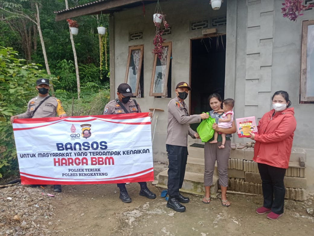 Sebagai bentuk rasa peduli kepada masyarakat terdampak penyesuaian harga bahan bakar minyak(BBM), Polsek Teriak Polres Bengkayang memberikan bantuan sosial berupa sembako kepada masyarakat Kec. Teriak.