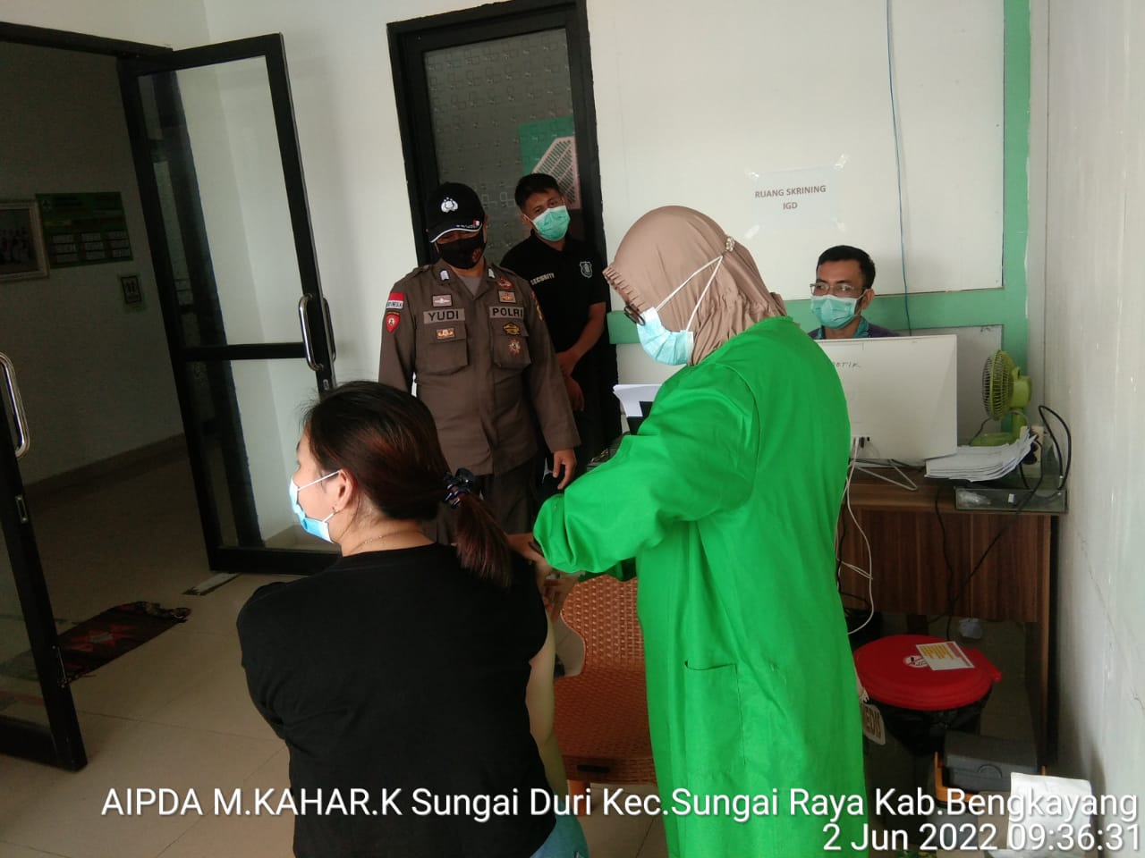 Pada hari Kamis Tanggal 02 Juni 2022 sekira jam 09.00 Wib, KA SPKT Polsek Sungai Raya Bripka Suyudi dan Ps.Kanit Sabhara Aipda M.kahar.k pantau langsung kegiatan Vaksinasi Covid – 19 di Puskesmas Sungai Duri.