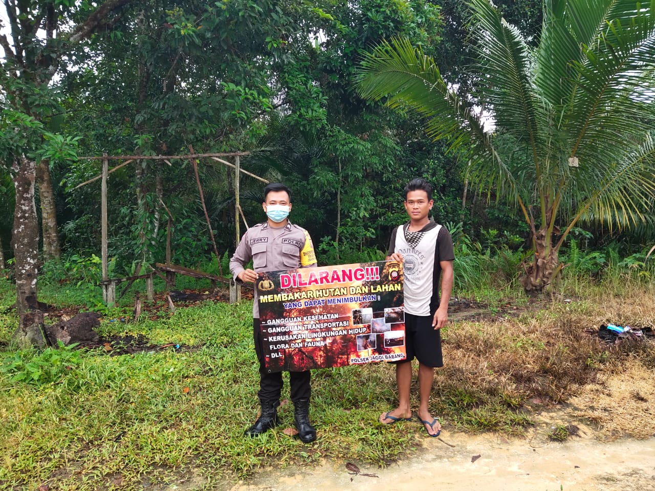 polres bengkayang,Polsek Jagoi babang-Brigadir sijabat sosialisasikan imbauan karhutla lewat banner dalam rangka melakukan pencegahan agar tidak terjadinya karhutla di desa binaannya