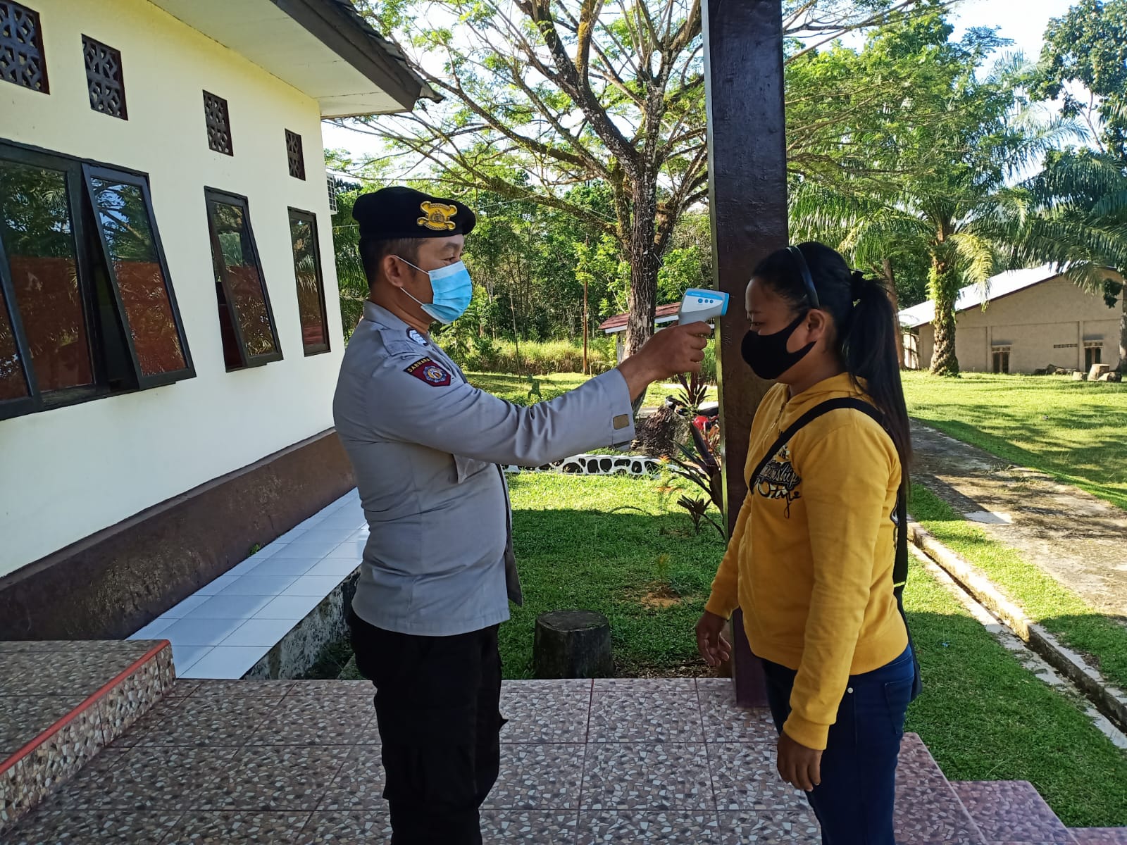 Terlihat Bripka Florentinus sedang mengecek suhu tubuh menggunakan termometer suhu ke warga yang di temuinya di Mako Polsek Monterado.