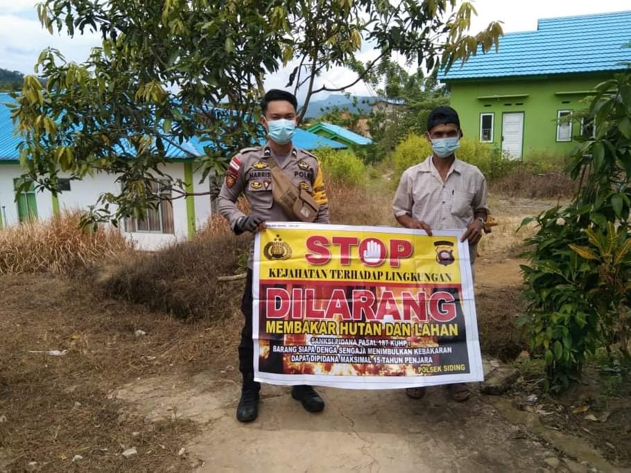 “Mari kita bersama menjaga kelestarian hutan dan lahan dengan tidak membakarnya karena dampak dari karhutla menyebabkan timbulnya asap yang dapat mengganggu kesehatan serta aktifitas masyarakat lainnya dan sudah ada Sanksi bagi Pelaku yang sengaja membakar hutan dan lahan”, himbau Bhabinkamtibmas Desa Siding Bripda Dainel Harris.