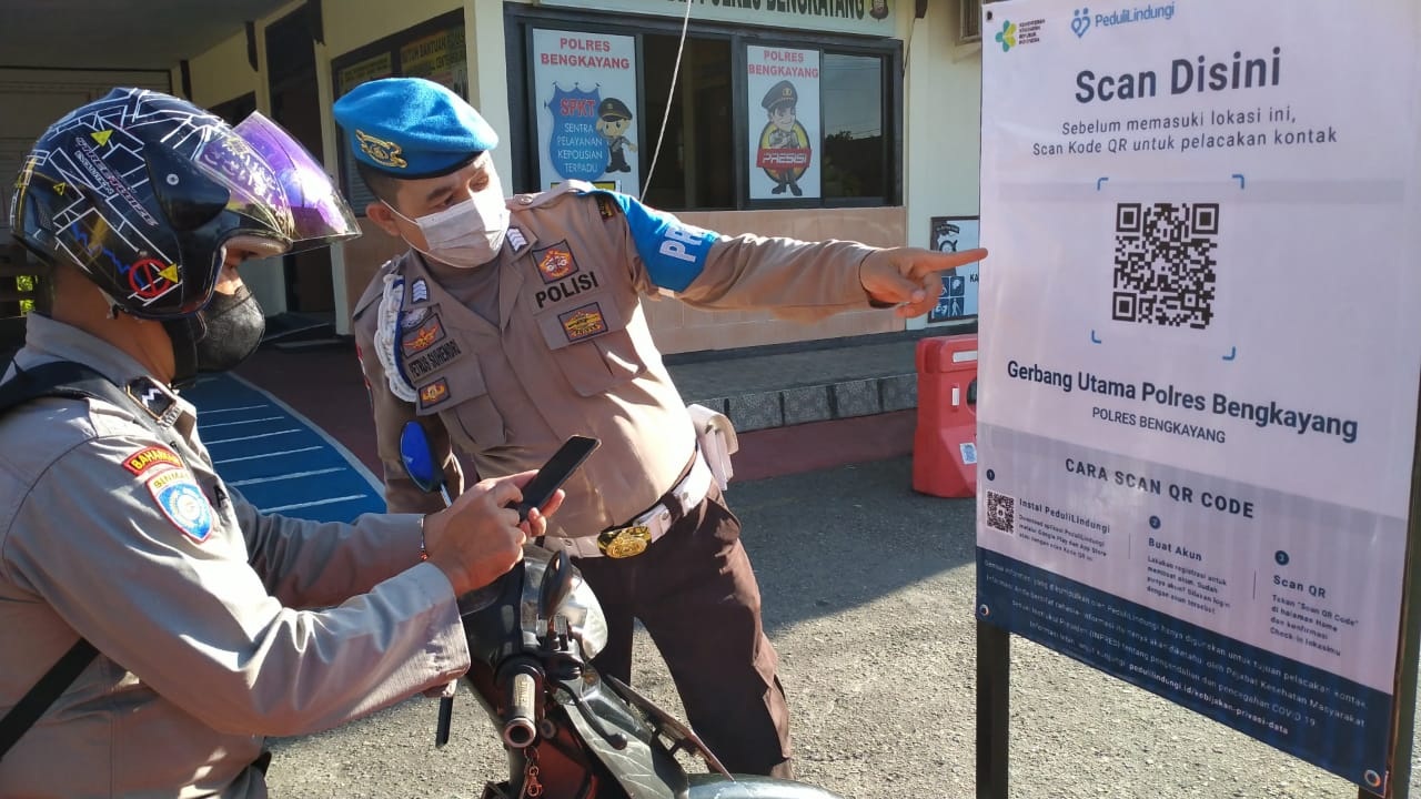 Anggota Polri dan masyarakat yang akan masuk Mako Polres Bengkayang wajib melakukan scan barcode di aplikasi peduli lindungi sebagai syaratnya yang berada didepan pintu masuk.