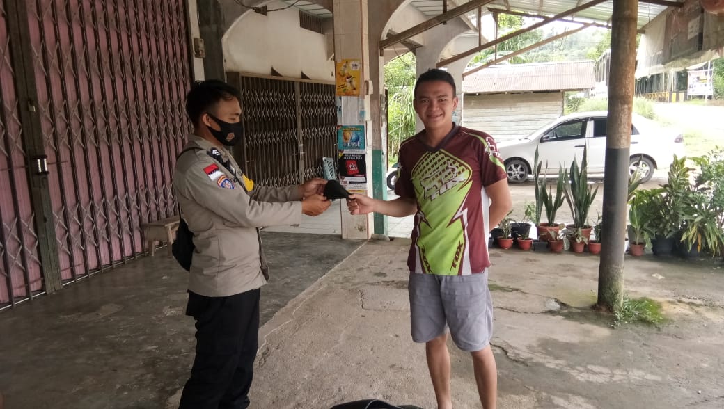 Mendatangi warga bhabinkamtibmas membagikan masker kepada warga dan mengingatkan serta mengimbau agar mematuhi imbauan pemerintah untuk menerapkan protokol kesehatan, Seperti memakai masker, menjaga jarak, mencuci tangan, menghindari kerumunan dan mengurangi mobilitas di saat masa pandemi covid 19