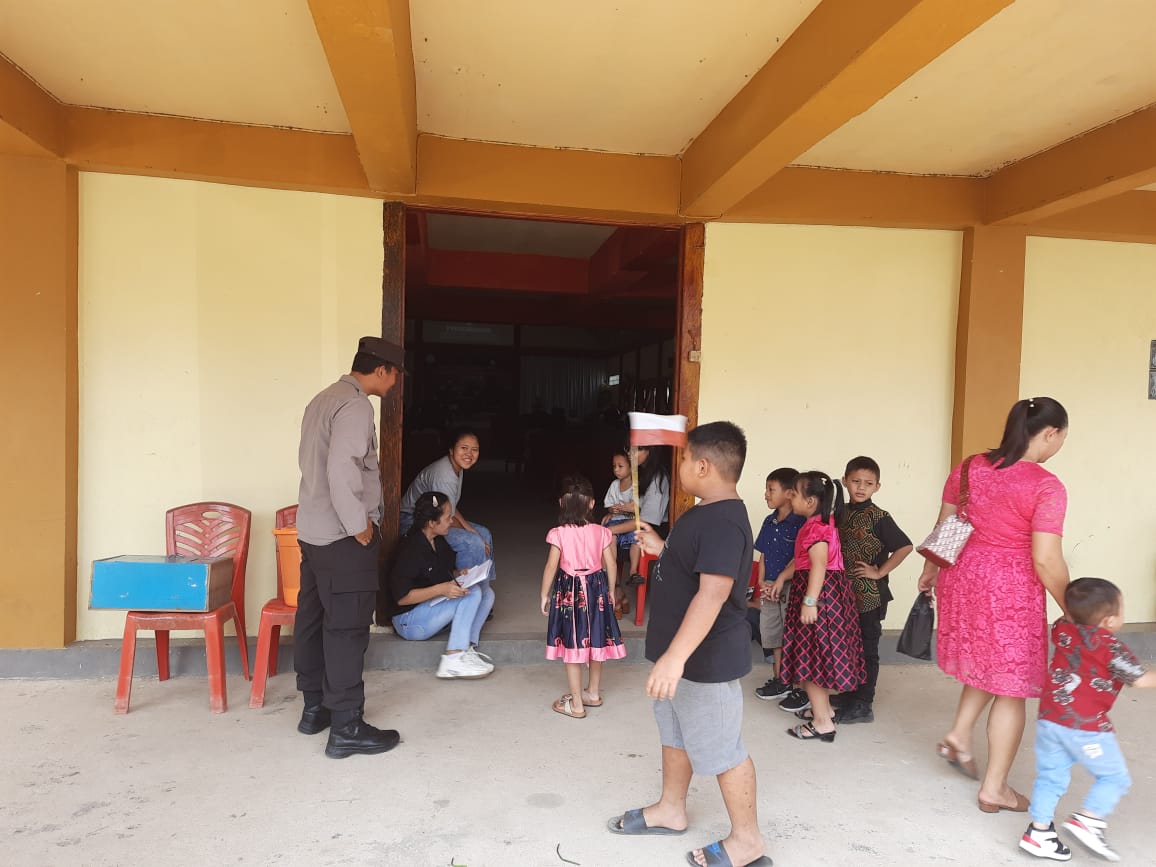 Sungai Betung, Bengkayang – “Minggu Kasih” Personil Polsek Sungai Betung laksanakan pengamanan serta jalin interaksi bersama anak-anak sekolah minggu di Gereja GPBI Rehoboth Sungai Betung, Minggu (05/11/2023).