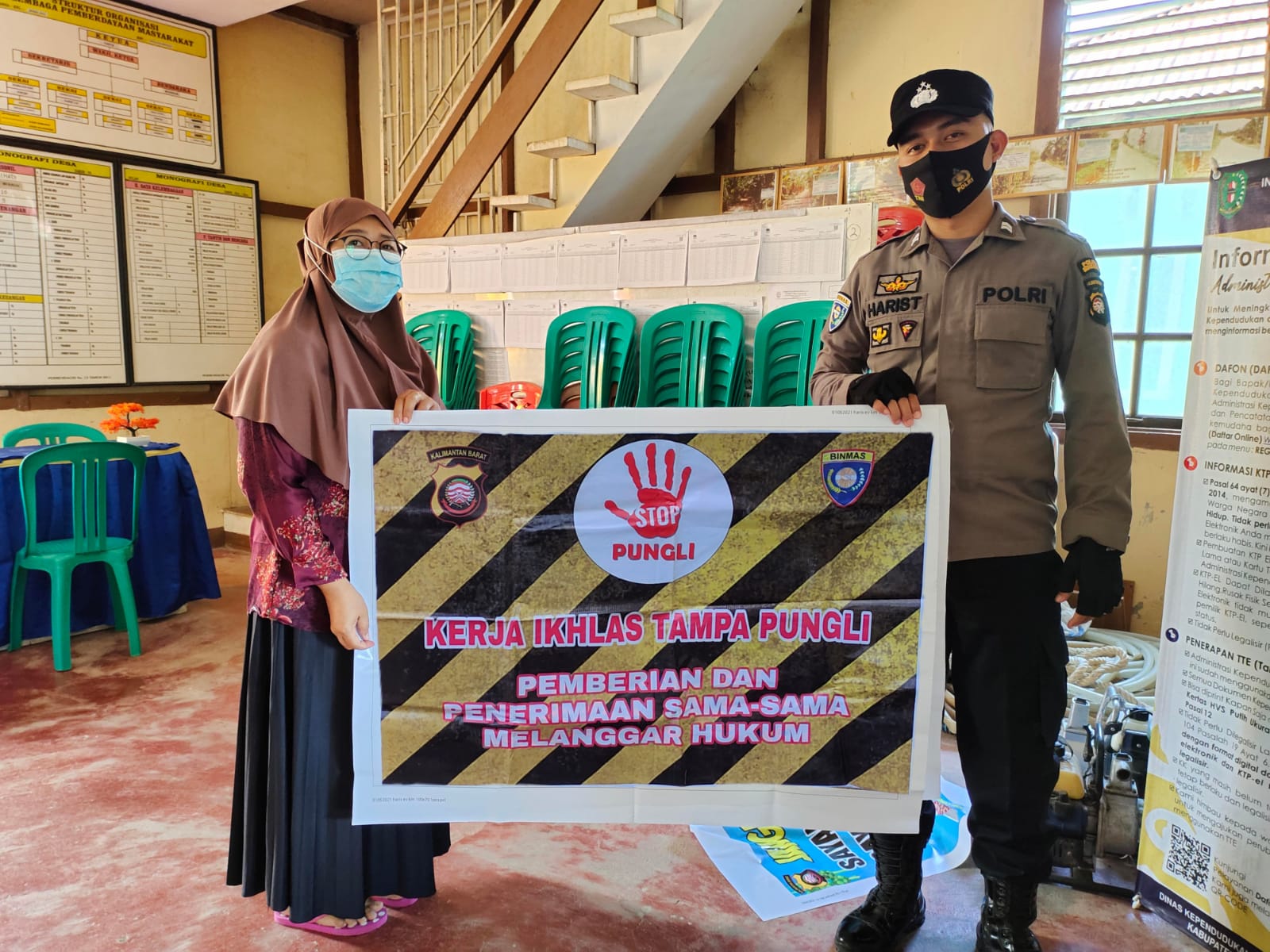 Hal tersebut di tunjukan foto bersama dengan warga melakukan foto bersama Briptu M.Harist menggunakan benner Stop Pungli.