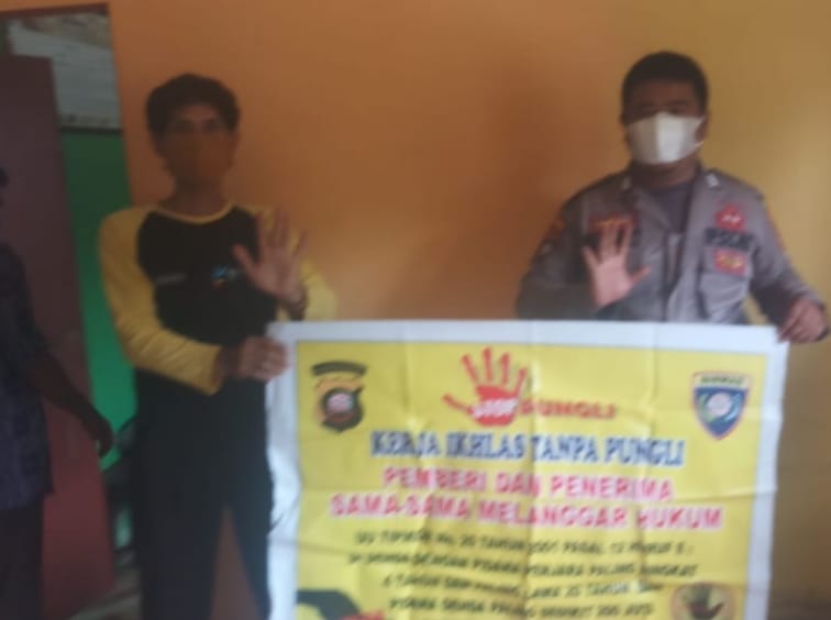 Briptu M.Harist lakukan himbauan Stop Pungli menggunakan Banner kepada warga di Desa binaanya, di Desa Sungai Duri Kecamatan Sungai Raya Kabupaten Bengkayang,Senin (24/10/22).