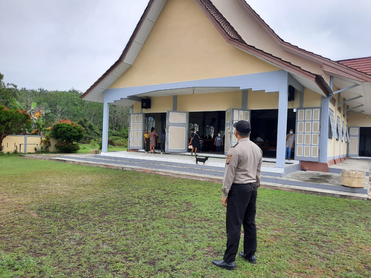 Polres Bengkayang-Polsek Monterado. Personel Polsek Monterado Bripka Herman beri pengamanan giat Ibadah Kebaktian di Gereja Katholik St. Mikael Desa Monterado Kec. Monterado Kab. Bengkayang, Minggu (07/11)pagi.