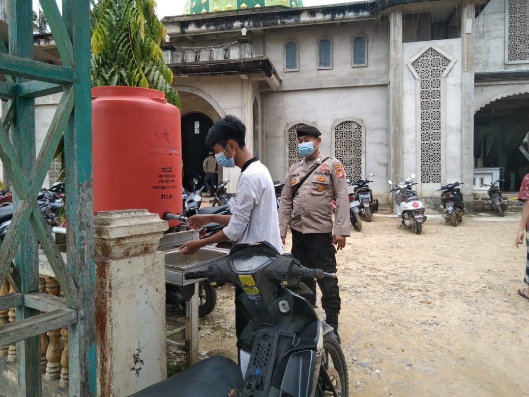 Dalam kesempatan tersebut Bripka Tinus terus mendisiplinkan Protokol Kesehatan kepada umat Muslim yang melaksanakan sholat Jumat dalam mencegah penyebaran virus Covid19 dengan .