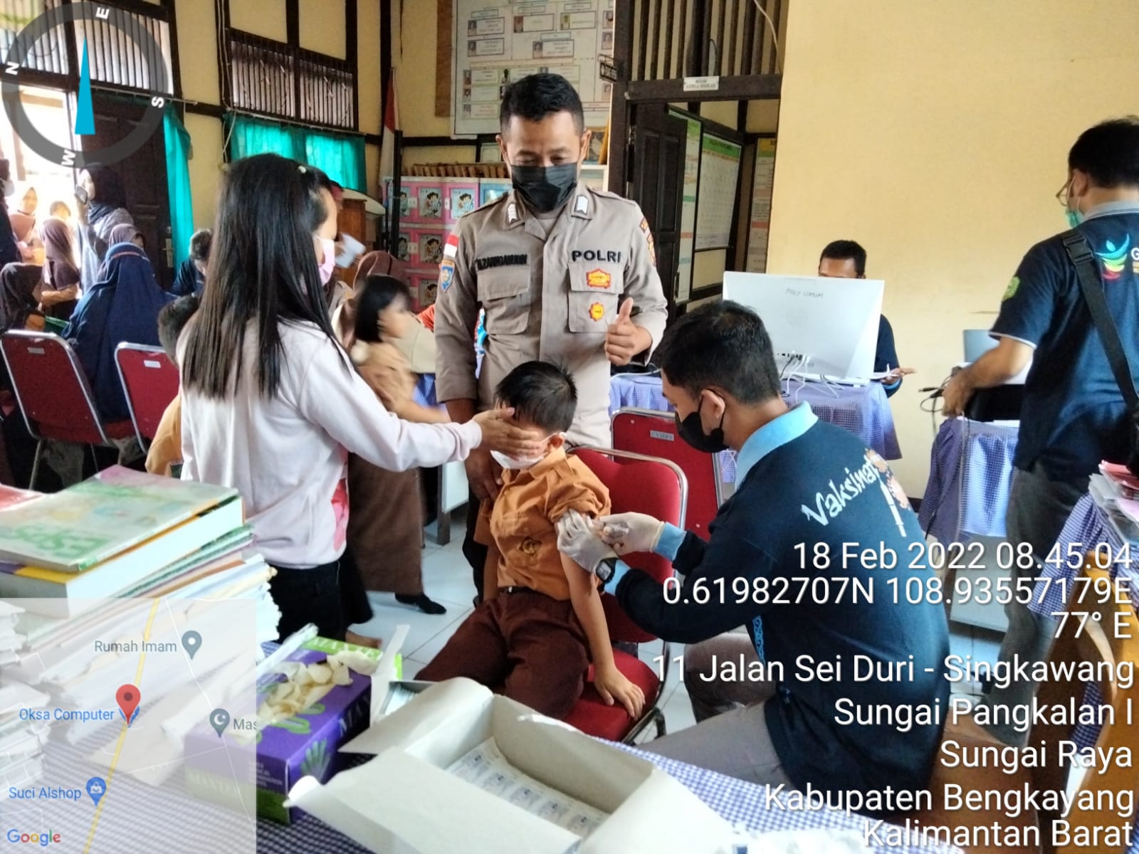 Polsek Sungai Raya – pada hari Jum’at tanggal 18 Februari 2022, sekira pukul 09.00 Wiba Bhabinkamtibmas Desa Sungai Pangkalan 1 Polsek Sungai Raya Bripka M.Zarnganudin memantau kegiatan Vaksinasi Covid 19 di SDN 06.