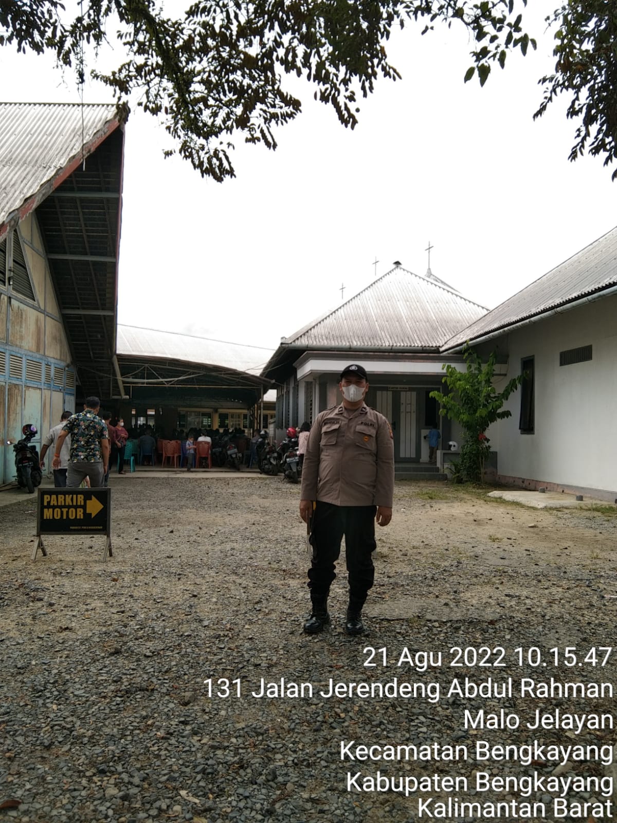 Anggota Polsek Bengkayang Polres Bengkayang dipimpin oleh Kanit SPK Polsek Bengkayang Aipda Minardus Zainudin pada hari Minggu tanggal 21 Agustus 2022 pagi melaksanakan pengamanan Misa di gereja Santo Pius X Bengkayang di Kelurahan Bumi Emas kecamatan Bengkayang Kabupaten Bengkayang.