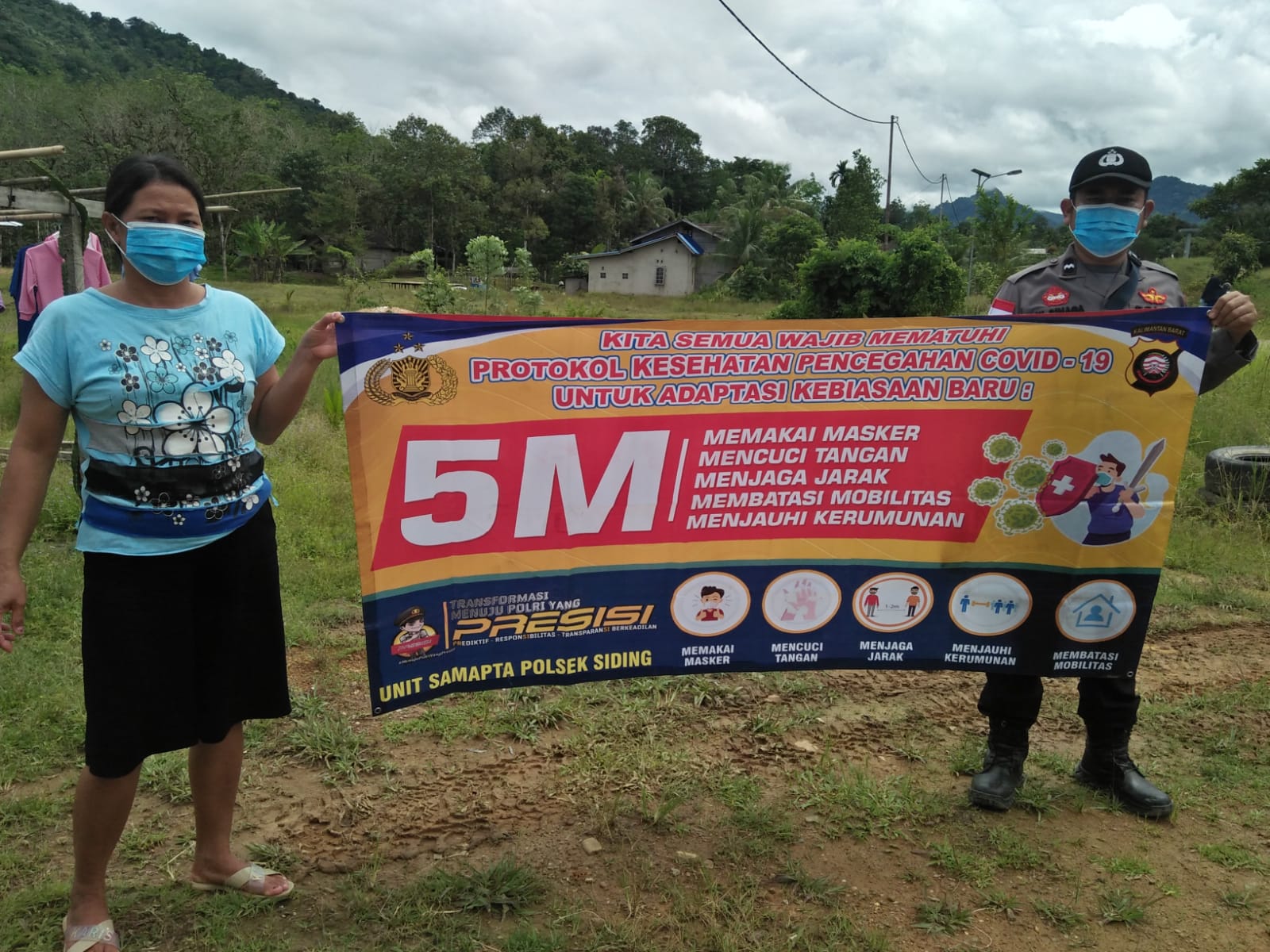 Disaat wabah virus corona yang sampai saat ini masih menjadi masalah di seluruh negara di dunia, anggota personel Polsek Siding terus berupaya melakukan pencegahan penyebaran Covid 19, salah satunya dengan memberikan himbauan kepada masyarakat serta membagikan masker kepada masyarakat yang tidak menggunakan masker.