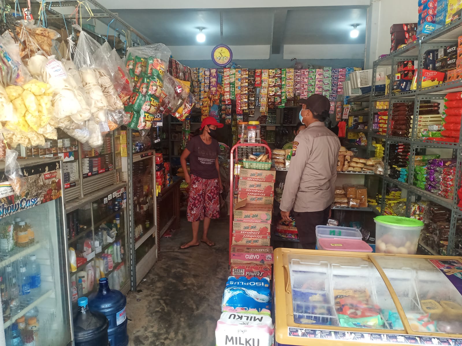 Polres Bengkayang – Polsek Monterado. Personel Patroli Polsek Monterado Briptu Heri patroli ke Pasar Monterado jumpai warga sampikan Imbauan Protokol Kesehatan 5M.